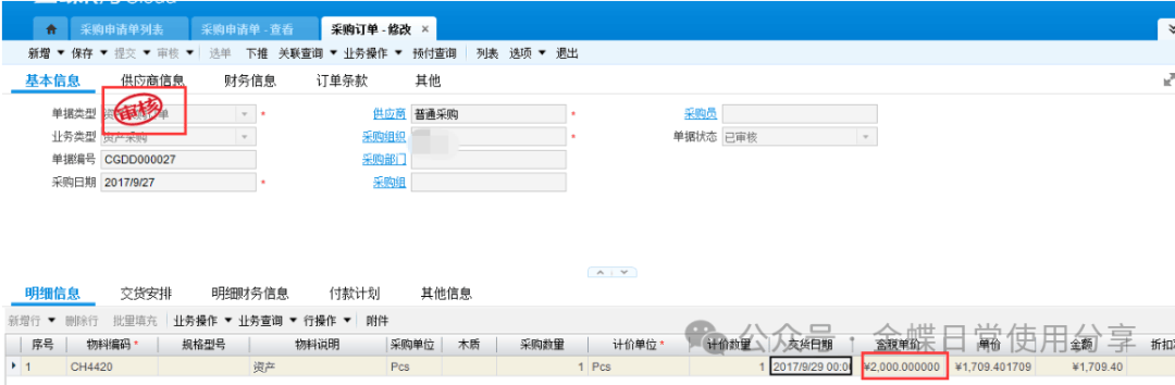 2.4 采购订单【业务场景】:企业用户新增采购订单 【用户角色】:采购员 【功能菜单】:【供应链】->【采购管理】->【采购申请】->【采购申请列表】->【下推采购订单】 【操作说明】:采购员填写单价并提交审核。