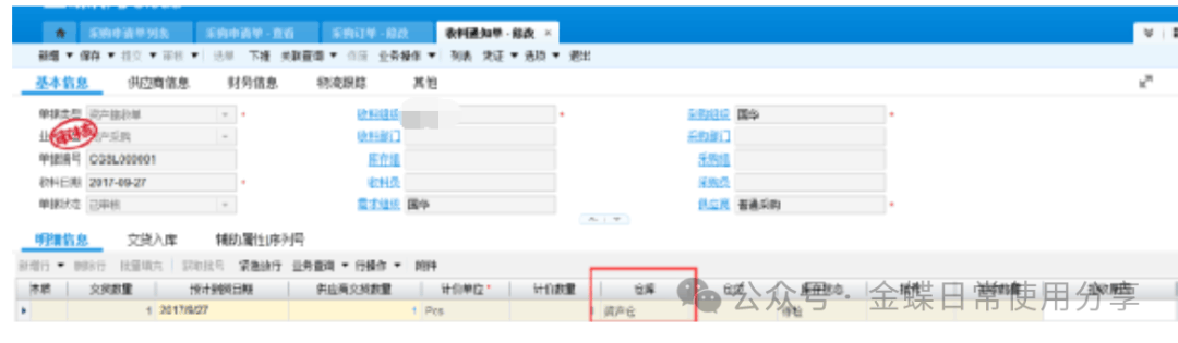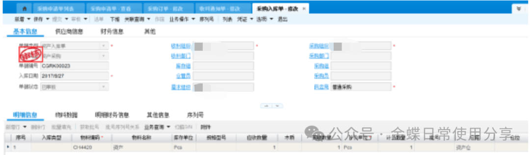 2.5采购收料【业务场景】:企业用户进行采购收料操作 【用户角色】:采购员 【功能菜单】:【供应链】->【采购管理】->【订单处理】->【采购订单列表-下推操作】 【操作说明】:采购订单下推收料通知单,若实际业务需要入库且该资产物料设置了允许库存,则填写仓库,否则直接提交审核,没有入库动作的直接看2.8。