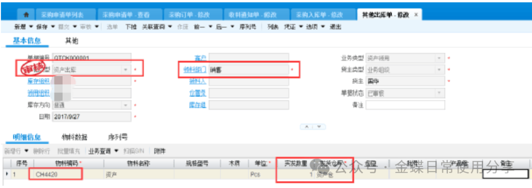 2.7资产出库【业务场景】:企业用户需要资产出库 【用户角色】:仓储员 【功能菜单】:产品路径:【供应链】->【库存管理】 ->【杂收杂发】->【其他出库单】 【操作说明】:已入库的资产在领用时需要进行出库处理,新增其他出库单,更改单据类型为资产出库,填写领用部门、物料编码、实发数量、发出仓库等信息并提交审核。