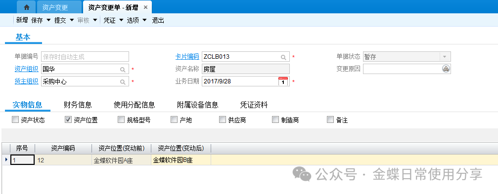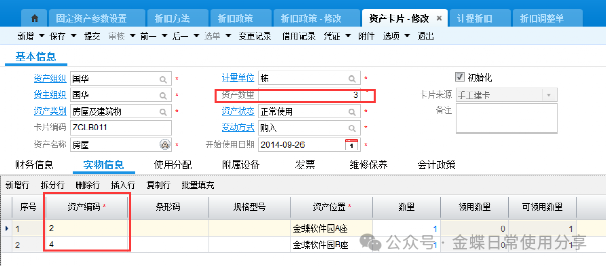若资产卡片存在一卡多物(同一种物料多数量)的状况,则在实物信息页签中,可以通过资产编码区分不同的实物资产,一般一个资产编码一个实物资产,每个资产编码对应资产位置及数量。 注意:当一张卡片一卡多物的时候,在进行调入等日常管理时,该卡片上的所有东西都要进行该操作,变更频繁的固定资产,不宜一卡多物。