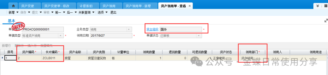 变更后资产卡片可以查看变更记录 3.4固定资产领用及借用【业务场景】:企业用户对固定资产进行领用及借用 【用户角色】:管理会计 【功能菜单】:【资产管理】->【固定资产】->【日常管理】->【资产领用】 【操作说明】:这里的固定资产领用及借用指的是资产非财务性质的进行使用部门的变化,若涉及财务物权的转移则使用固定资产挪用。 领用:首先选择货主组织,再选择资产编码,若选不到资产编码,检查货主组织,填写领用数量及领用部门,并提交审核。