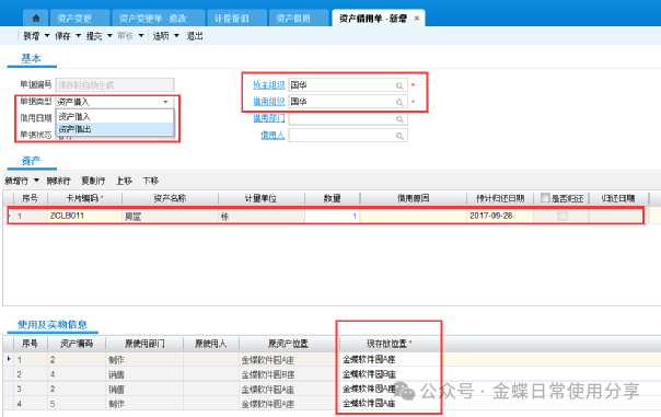 产品路径:资产管理-固定资产-日常管理-资产借用 借用:根据此资产是借入还是借出来选择单据类型,选择货主组织及借用组织,选择卡片编码及数量,实物信息位置有改变的进行更改,没有改变的不维护。 因为系统支持一卡多物,实物信息会带出这张卡片上的所有实物,所以如果只借用一张卡片中的一个,请维护你借用的那一个。维护完数据提交审核。