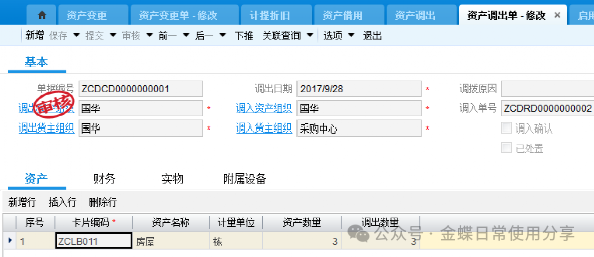 3.5固定资产挪用【业务场景】:固定资产组变更 【用户角色】:管理会计 【功能菜单】:【资产管理】->【固定资产】->【日常管理】->【资产调出】/【资产调入】 【操作说明】:选择调出资产组织及货主组织,调入资产组织及货主组织,填写需要调出的卡片编码,并提交审核 资产调出单审核后,调入货主组织会自动生成一张创建状态的资产调入单 如果在资产调入列表中没有看到单据,查看所在组织是否是调入货主组织,选择单据提交审核。