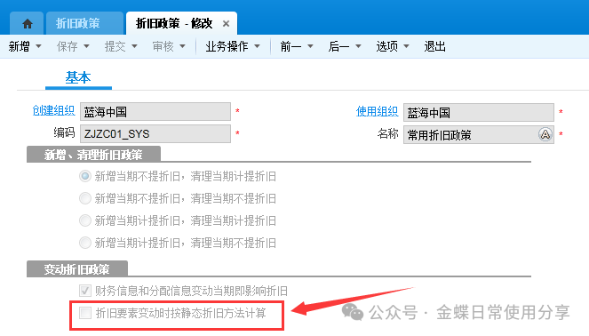 3.如果资产变更了财务页签下信息,还是想按照静态折旧公式进行折旧,可以勾选折旧政策中的参数“折旧要素变动时按静态折旧方法计算”;