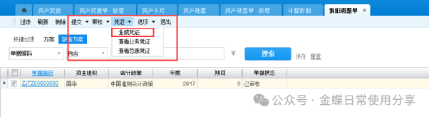 选择需要生成凭证的单据,点击“生成凭证”,生成计提折旧凭证,还可以通过列表中查询单据的业务凭证及总账凭证。 生成资产卡片凭证