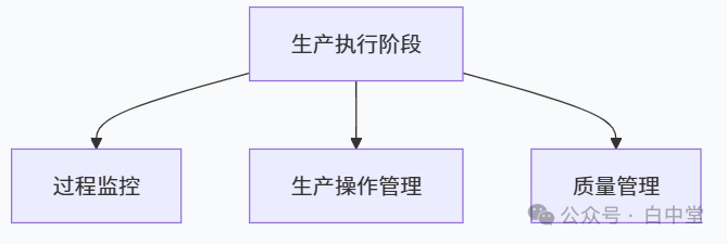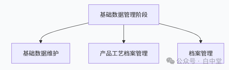再进一步可按照颜色块和功能布局,把生产过程分为四大阶段,N个控制点。白中堂命名为:基础数据管理、生产准备、生产执行、产后分析。一、生产过程的四个核心阶段1. 基础数据管理阶段:打好生产管理的地基