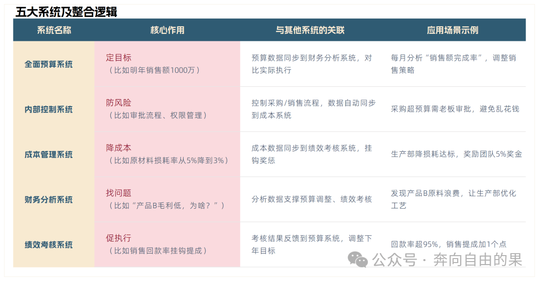 财务管理体系不是“一堆制度+几张报表”,而是“让数据跟着业务跑,让老板不用跑现场就能管公司”的工具。它的核心逻辑很简单:把分散在各部门的“碎片信息”串成“数据链条”,用表格和系统把“业务动作”翻译成“财务语言”,最终变成老板能看懂、能决策的“经营仪表盘”。 ![]() 第一步:先“摸透家底”——调研公司具体情况建体系前,必须先搞清楚“公司现在什么样”,否则设计出来的东西就是“空中楼阁”。 1. 调研流程:先聊老板,再看业务第一步:跟老板深聊:问3个关键问题—— 第二步:实地调研业务:跟着采购、销售、仓库走一遍流程—— 2. 调研重点:抓“影响财务的关键细节”采购部:供应商账期是30天还是60天?有没有“压款”的强势供应商? 销售部:客户回款周期是多久?有没有“老赖”客户? 仓库:库存周转天数是20天还是60天?有没有“压箱底”的积压货? 生产部:原材料损耗率是多少?有没有“边角料浪费”的情况? 第二步:按需“画图纸”——设计老板看得懂的信息表调研完,接下来要做**“老板专属信息表”**:把老板最关心的数据浓缩成“一张表”,让他不用翻10张报表就能掌握全局。 1. 采购部门信息表:盯紧“钱花在哪、货够不够”老板最关心采购的3件事:供应商靠谱吗?钱付得值吗?库存够不够? 用一张表整合: ![]() Excel模板提示:用“条件格式”标红异常数据,老板一眼能看到风险。 2. 销售部门信息表:盯紧“钱从哪来、客稳不稳”老板最关心销售的3件事:卖得怎么样?客户靠谱吗?钱能收回来吗? 用一张表整合: ![]() 第三步:搭“数据流水线”——让信息从基层流到老板有了信息表,接下来要建**“数据收集-汇总-分析”的流水线**,确保数据“准、快、全”。 1. 数据流程:从“基层填数”到“老板决策”闭环![]() 2. 关键:明确“谁填、何时填、填什么”基层员工:采购员每天下班前填“采购明细表”(供应商、金额、账期);销售员每周五填“客户回款表”(客户、金额、逾期天数) 部门负责人:每周一对上周数据进行汇总,标红异常(回款逾期超10天的客户等) 财务部门:每月5日前整合所有数据,生成“老板仪表盘”(用Excel透视表或BI工具,比如Power BI等等) ![]() ![]() (注:模板可直接复制到Excel,用“条件格式”设置异常标记,老板打开就能看重点。) 第四步:装“五大引擎”——让体系“活起来”光有数据还不够,得用五大系统把数据变成“管理能力”,支撑公司运营: 五大系统及整合逻辑![]() 五大系统关联逻辑图![]() 财务管理体系不是“枷锁”好的财务管理体系,不是“管着大家干活”,而是“帮大家把活干对、干好”。 -END- 阅读原文:原文链接 点晴模切ERP更多信息:https://moqie.clicksun.cn,联系电话:4001861886 该文章在 2026/1/16 12:53:27 编辑过 |