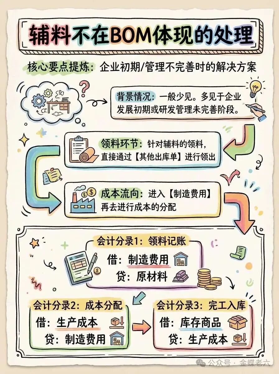 如果辅料「文章就使用这个名称」不在BOM体现,这种情况一般比较少,一般处于企业发展初期,或者研发管理还没有完善的情况会有。