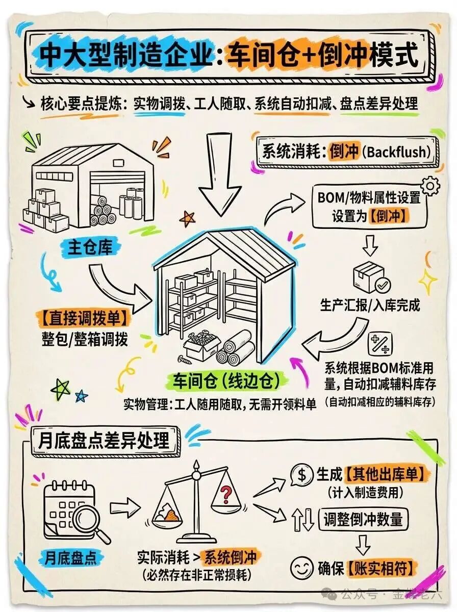 当生产汇报(或入库)完成时,系统根据BOM设定的标准用量,自动从“车间仓”扣减相应的辅料库存。