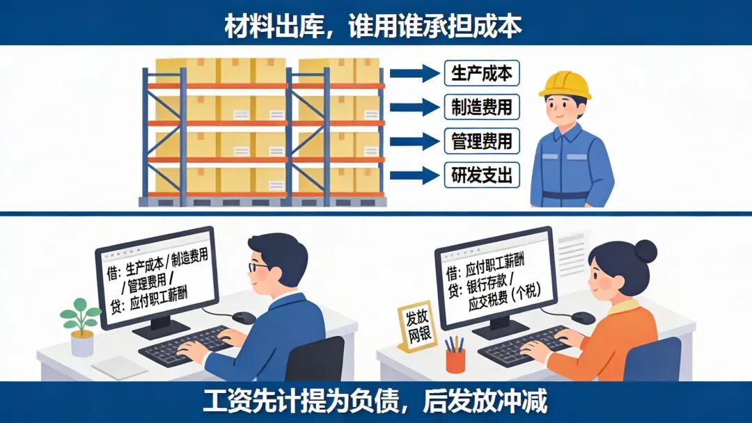 产品成本料工费,生产账户记明细;材料发出看用途,工资计提再发放。