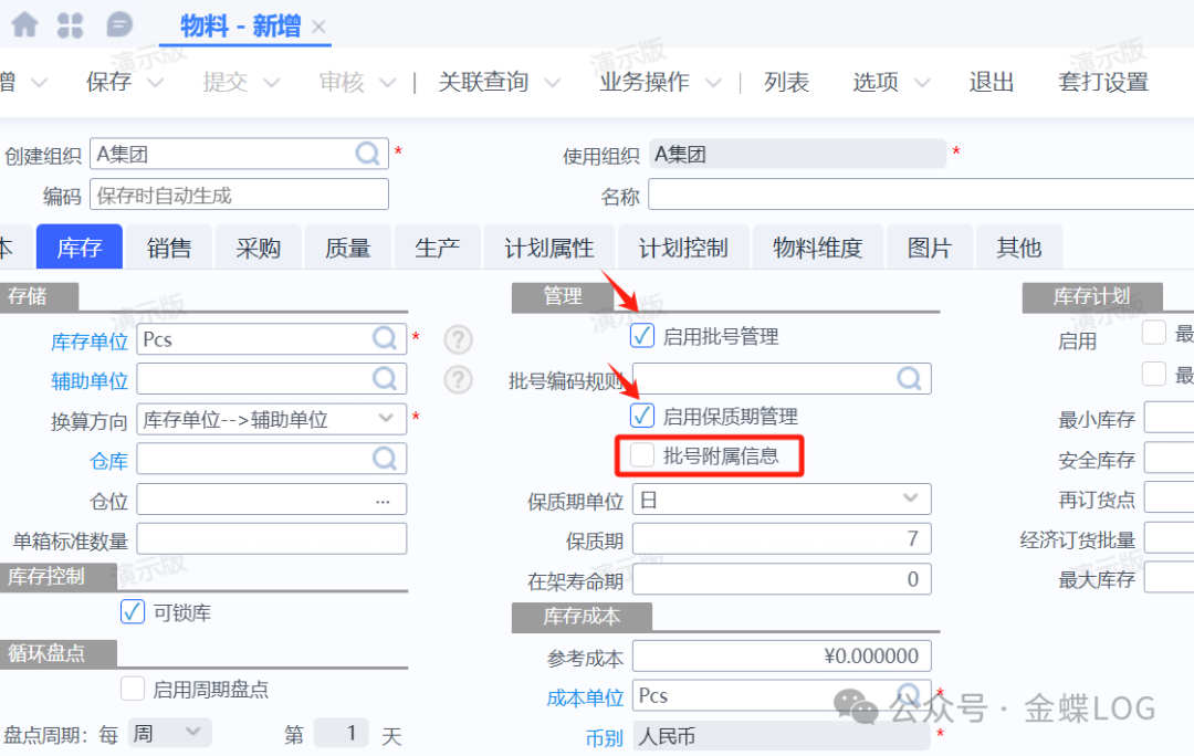 ①若物料仍可降级使用或报废,可通过其他出库单办理出库(不计入销售)。 ![]() ②若因复检合格需要延长有效期,可通过批号调整单修改有效期至,调整后可恢复正常出库。 ![]() ③若销售出库单一定要出过期物料,可以在BOS平台保存按钮放开保质期校验。 ![]() 五、批号与保质期的关系如果物料同时启用批号管理和保质期管理,系统提供了一个重要关联字段——【批号附属信息】,它决定了批号与保质期的绑定关系。 情况一:不勾选【批号附属信息】
