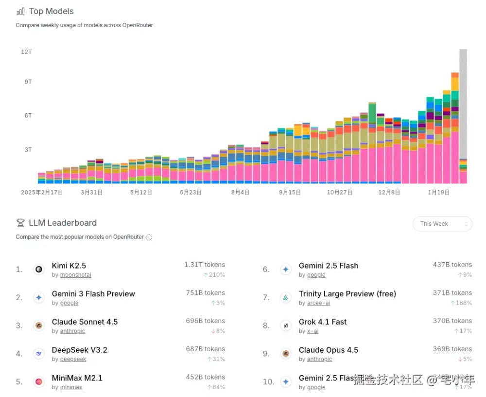 OpenRouter 的周排行榜和 OpenClaw调用请求量榜单,Kimi K2.5 长期霸榜第一,大幅领先于 Gemini 3。