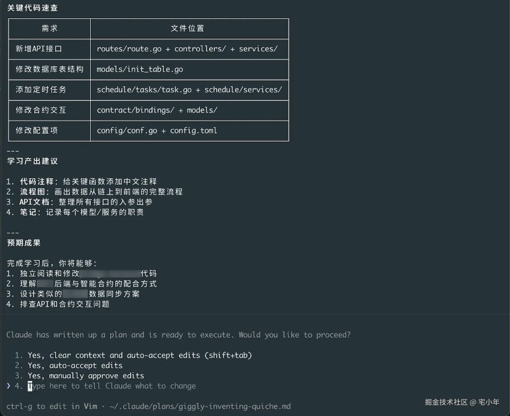 💡 小技巧:我一般会选 4,然后输入:"先把计划保存到 plan.md,我们再继续"。这样方案留底,后面出问题了还能回溯。等保存完了再选 2 让 Claude 自动执行。