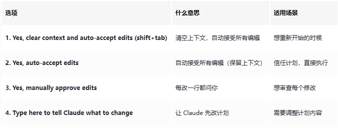 当 Claude Code 输出计划后,会让你选择: