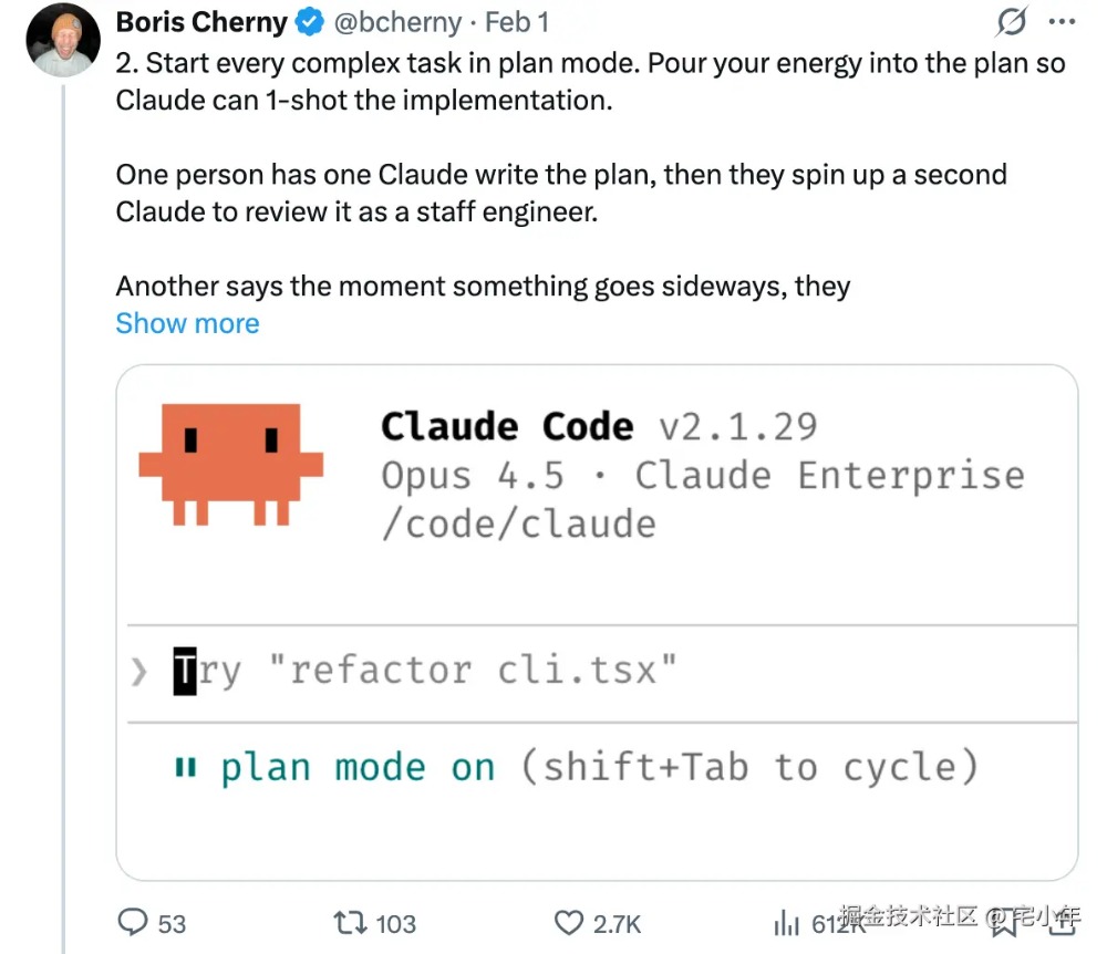 前面已经说过 Plan Mode ,创始人也提到了说明 Plan Mode 的重要性。