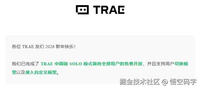 以前要用上它,可能要排队等白名单,还得琢磨一下权限或者费用。但从现在开始,只要你的 TRAE中国版 IDE 更新到最新版本,点进去就能直接切换到 SOLO模式,免费使用。
