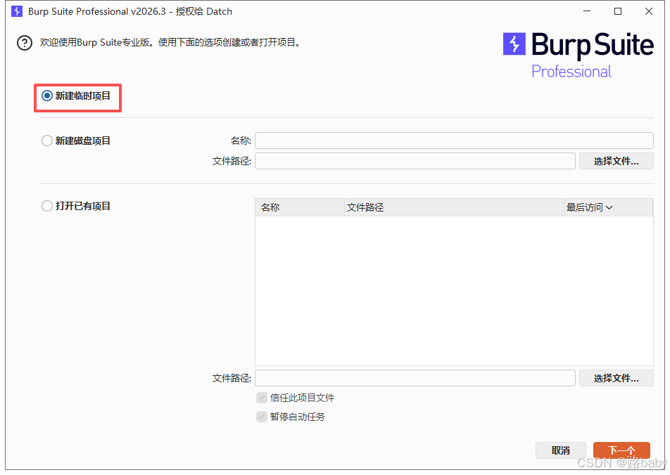 点击完成会自动运行burp(如果没运行burp 关闭注册机就会出来了) tips:后续就不需要在使用注册机了,除非你清除数据!!! 这里我们选择新建临时项目(不会产生一定量的缓存)
