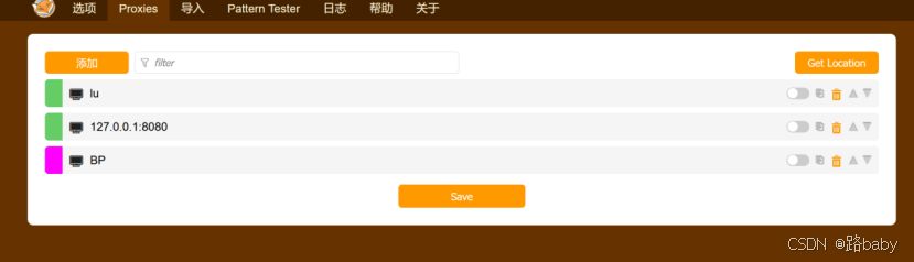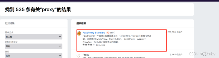 然后这就是一个汉化之后的bp页面相比英文版的对于新手还是方便了许多 之后直接在应用程序里面启动 BP 就可以了,和官方正版使用毫无差别,优雅永不过时~ 设置代理Proxy(代理模块)Burp Proxy (代理)是 Burp Suite 以用户驱动测试流程功能的核心,通过代理模式,可以让我们拦 截、查看、修改所有在客户端和服务端之间传输的数据。 Proxy (代理)模块又分为四部分,分别是 Intercept(拦截) , HTTP history(hhtp历史记录) , WebSocketshistory(webSockets的历史记录) , Proxy settings (代理设置)(低版本叫做 Options )。 代理的出现在接受数据包和发送数据包的时候提供了修改数据包的机会 因为 Burp suite 默认监听本地8080端口,所以我们需要把浏览器的流量转发到8080端口, Burp suite 即可收到,进行相应的操作。 google浏览器推荐使用 Proxy SwitchyOmega 插件 Firefox浏览器推荐使用 FoxyProxy Standard 插件 这里我们以Firefox为例 为什么 因为火狐浏览器 不需要科学上网 Firefox设置代理我们这里来安装FoxyProxy Standard 插件 浏览器右上角点开三条杠 打开扩展与主题