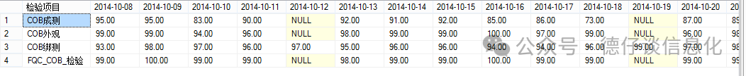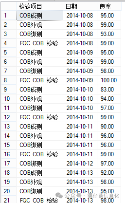 --抓取数据写入临时表#tempcobselect a.检验项目 , CONVERT(char(10),a.日期,120)日期,Convert(decimal(18,2),cast((SUM(a.测试数量)-SUM(a.不良数量)) as decimal(18,2))/sum(测试数量))*100  as 良率 into  #tempcobfrom (select 日期,检验项目, 测试数量, 不良数量 from 制程COB成测 union all select 日期,检验项目, 测试数量, 不良数量 from 制程COB外观 union all              select 日期,检验项目,测试数量, 不良数量 from 制程COB绑测 union all select 送检日期,'FQC_COB_检验',检验数量,不合格数量 from 制程FQC_COB_检验   ) as a   where CONVERT(char(10),日期,120)>='2014-10-01'  and CONVERT(char(10),日期,120)<= '2014-10-30' group by a.检验项目,a.日期