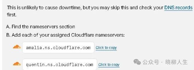 4. 取得新名称服务器Cloudflare在新页面中,提供了两个nameserver: