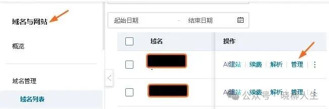 这个页面不要关,后面要用。 5. 更新名称服务器登录到阿里云的“域名与网站”控制台,选择“管理”: