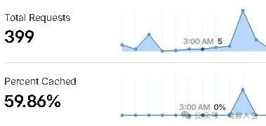 至此,域名转托管完成,CDN、DDOS防护、SSL全都自动生效。简单验证下: 1. ping你自己的域名,得到的已经不是你的VPS服务器地址——你的服务器地址被cloudflare隐藏、保护起来了。 2. 在控制面板上可以查看最近24小时的CDN缓存。比如我自己的一个小测试站最近一段时间的缓存数据如下: