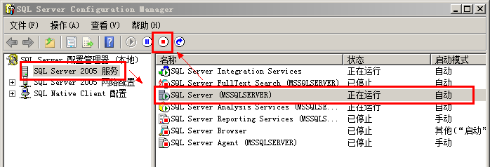 这两个文件clicksun.mdf、clicksun_log.ldf一般在 D:\clicksun_DB 下,找不到的话,就自己在资源管理器里面全盘搜索一下。将这两个文件复制前一定要先停止SQL Server服务,否则无法复制成功。下面以SQL server2005为例说明停止SQL Server的方法:打开Windows开始-》所有程序-》Microsoft SQL Server 2005-》配置工具-》SQL Server 外围应用配置器,将SQL Server停用,然后就可以成功将clicksun.mdf、clicksun_log.ldf两个文件复制出来了: