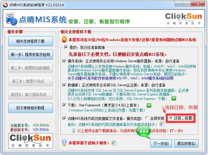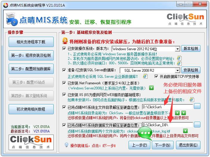 以上“相关支持程序下载”页面注意操作类型要选择为“迁移、恢复”,然后按照页面提示点击“下一步”,进入“第一步:程序安装及检测”,将上面备份好的文件和数据库分别放到目录:“D:\ClickSun”、“D:\ClickSun_DB”,切勿使用此安装程序提供的空白系统文件和数据库: