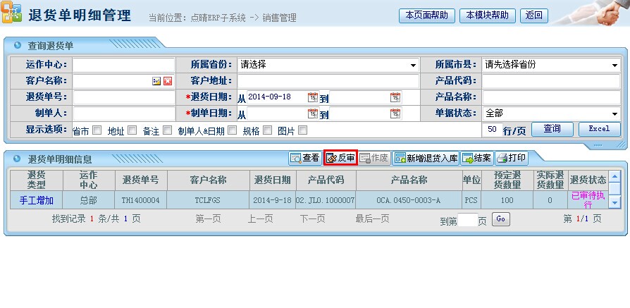 操作步骤:销售管理——销售退货单管理——退货单明细管理;进入页面如下图操作: 点击“反审退货单”即可 销售退货单作废操作:销售管理——销售退货单管理——退货单明细管理;进入页面如下图操作: 点击作废进入作废确认页面: 点击“作废指定产品及数量”即可。