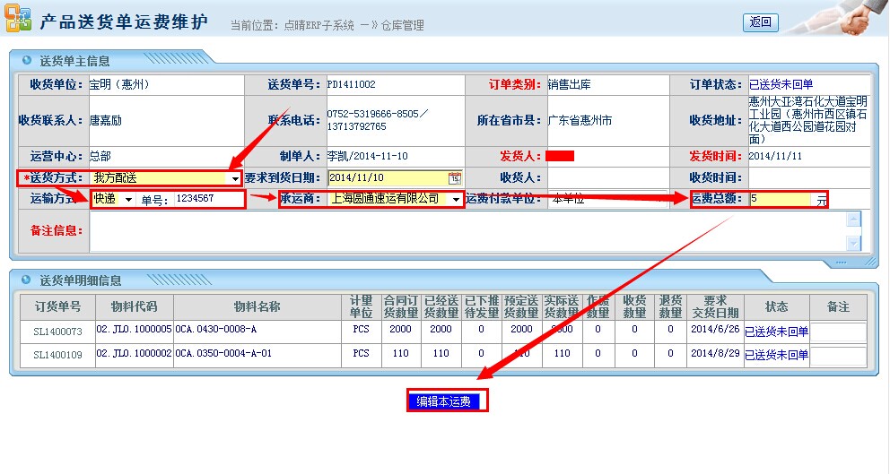 点晴模切ERP仓库管理—仓库出库管理之送货单快递运费录入操作