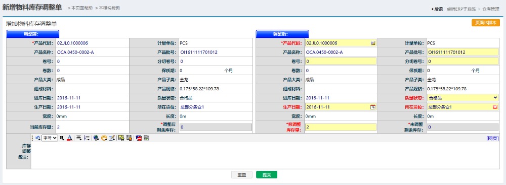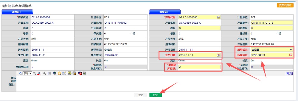 在此页面可进行数量,货位,质量状态,生产日期等资料的调整。填好必要信息后,点击“提交”即可。