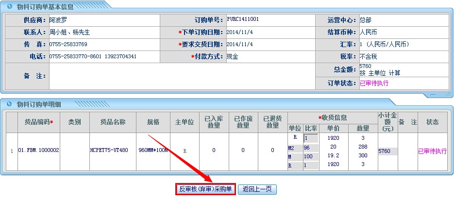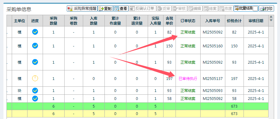 如果订单中有已经结案的明细项目,那么这张订单是不允许反审驳回的。像下面这张单一共6个物料,只有一个还在“已审待执行”状态,其余均已结案,那么这张单是不允许反审驳回的,只能将有问题的物料行异常结案关闭,重新下单。
