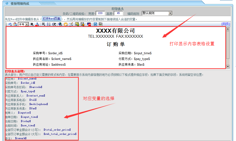 第二部分:表头表格设置;表头变量设置,如下图所示:
