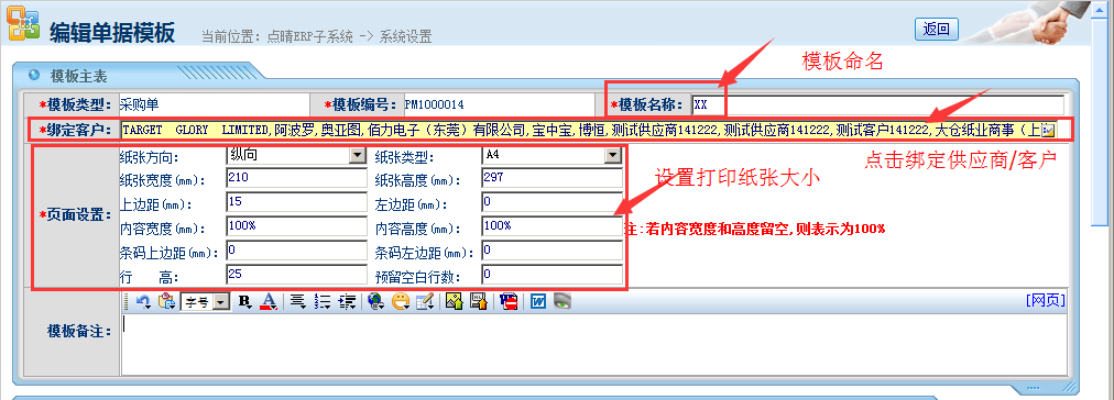 第一部分:模板名称录入、绑定客户设置、页面纸张大小设置,如下图所示: