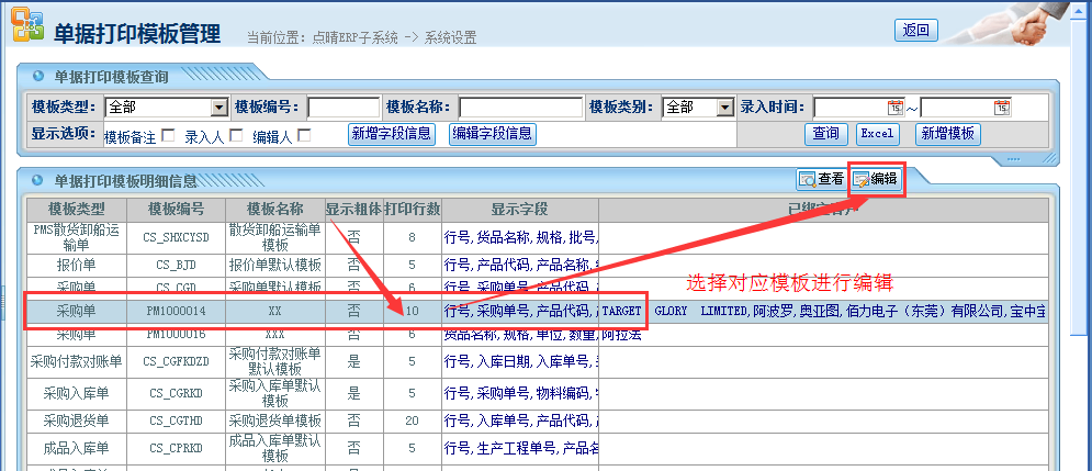 选择需要设置的单据模板——点击“编辑”按钮,如下图所示:
