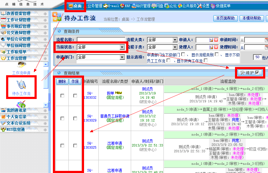 某员工岗位调整了,如何一键转移未离职员工的工作流到另外一个员工的账号上?如果该员工是未离职仍在职,只是调整到其他岗位工作,那么先暂时不要在点晴OA中调整该员工的岗位,要该员工以当前岗位身份,将未及时处理的待办工作流单据应该立即处理完毕,无法立即处理的,应该作废掉或驳回(申请人和审核人都有作废权限)。然后网管再调整该员工...