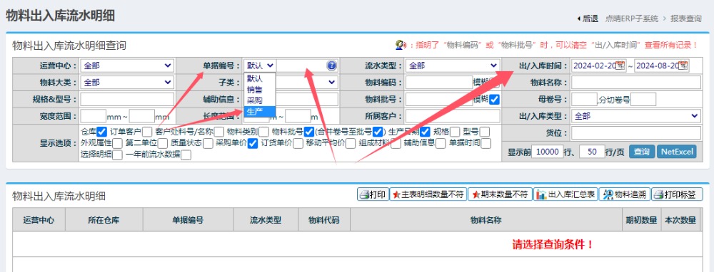 【点晴模切ERP】如何实现以生产工单号查询到对应的物料使用批次,便于查询和追溯物料异常的范围进入仓库管理-》物料流向管理-》物料出入库流水明细中(如果看不到此菜单,则应该向管理员申请开放此菜单访问权限):在物料出入库流水明细查询页面,根据实际需要查询的单据类型,选择单据编号中的类型为:销售/采购/生产,然后输入销售单/...