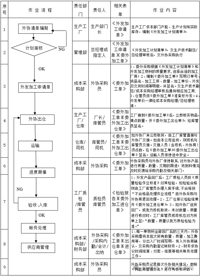 1.目的为了规范我公司所有外包加工业务的管理,使外包产品的加工保质、准时地满足生产计划所需的物料,确保公司经营目标的全面实现,特制定本办法。2.适用范围适用于我公司外发加工的所有产品。3.职责3.1生产工厂负责将《生产计划》下发放到相关部门;安排工厂专员负责外发进度的跟踪;3.2生产厂负责《外发加工计划清单》的编写,生...