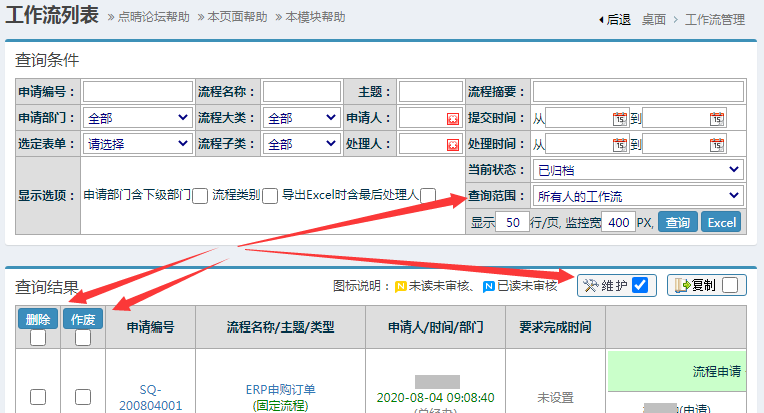 为避免引起误会和纠纷,建议管理员不要直接删除已经归档的工作流申请,应该创建一个“已归档工作流申请删除流程”,在申请内容注明申请删除的具...