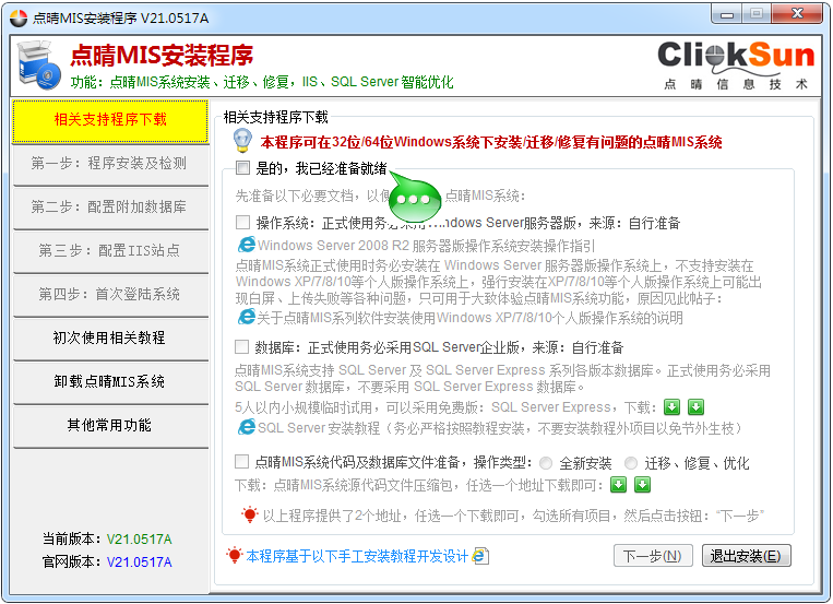 程序说明:点晴MIS系统安装程序可以:1、安装全新点晴MIS系统;2、修复已经安装完毕但出错的点晴MIS系统;3、迁移点晴MIS系统到其他电脑;4、优化点晴MIS系统的IIS和SQLServer相关参数。本程序是基于此手工安装点晴MIS系统教程而开发的辅助程序:http://4476.oa22.cn 特别说明:安装前...