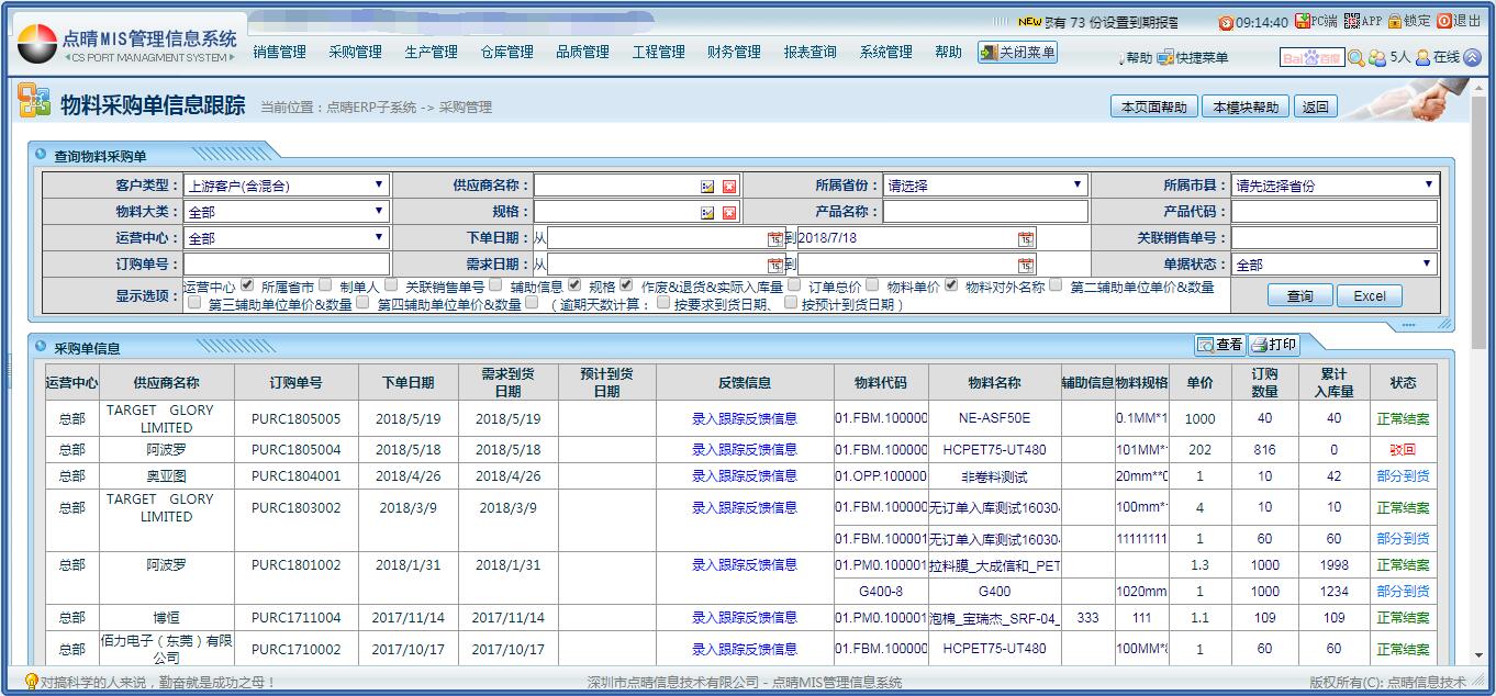 4. 采购订单录入:采购订单的直接入口,需输入订单所需的全部数据,允许同一采购单有不同的交货日期及交货地点。提供选择是否打印采购订单的功能。