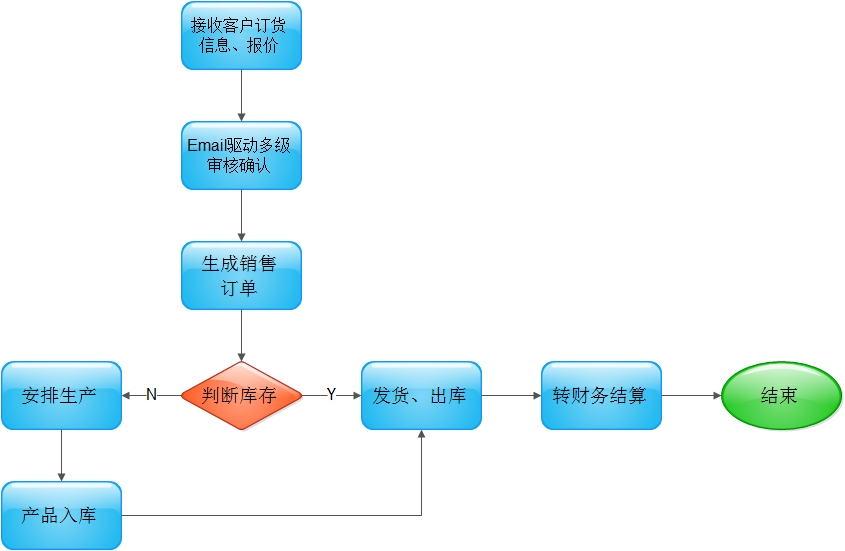 接收客户产品需求,制定报价单,通过Email驱动审核确认后生成销售订单,系统自动判断库存是否满足销售订单需求,如果满足销售订单则系统生成出库订单,进行发货、出库、转财务结算模块进行费用处理,如果库存不满足销售订单则系统生成缺货报告,系统同时生成原物料需求,帮助制定原物料采购计划,原物料采购入库后可进行生产计划安排,安排生产。生产完成后可进行入库操作,从而进行发货、出库、转入财务模块进行费用处理。
