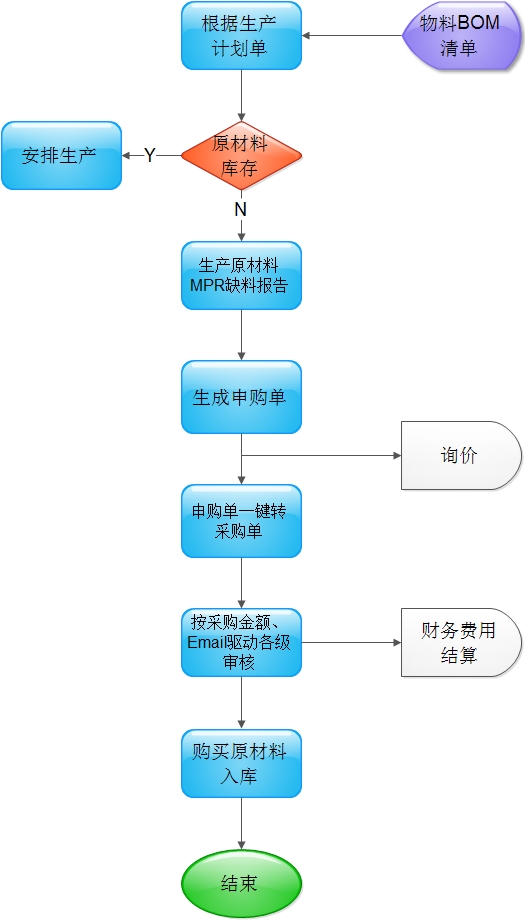 根据产品生产计划单,原物料BOM清单,系统自动判断原物料库存是否满足订单生产需要,不满足生产订单时生成原物料缺货报告。根据原物料缺料报告制定采购计划,根据采购计划单总金额大小并通过Email系统自动驱动各级审核后确认采购供应商,购买原物料、入库。
